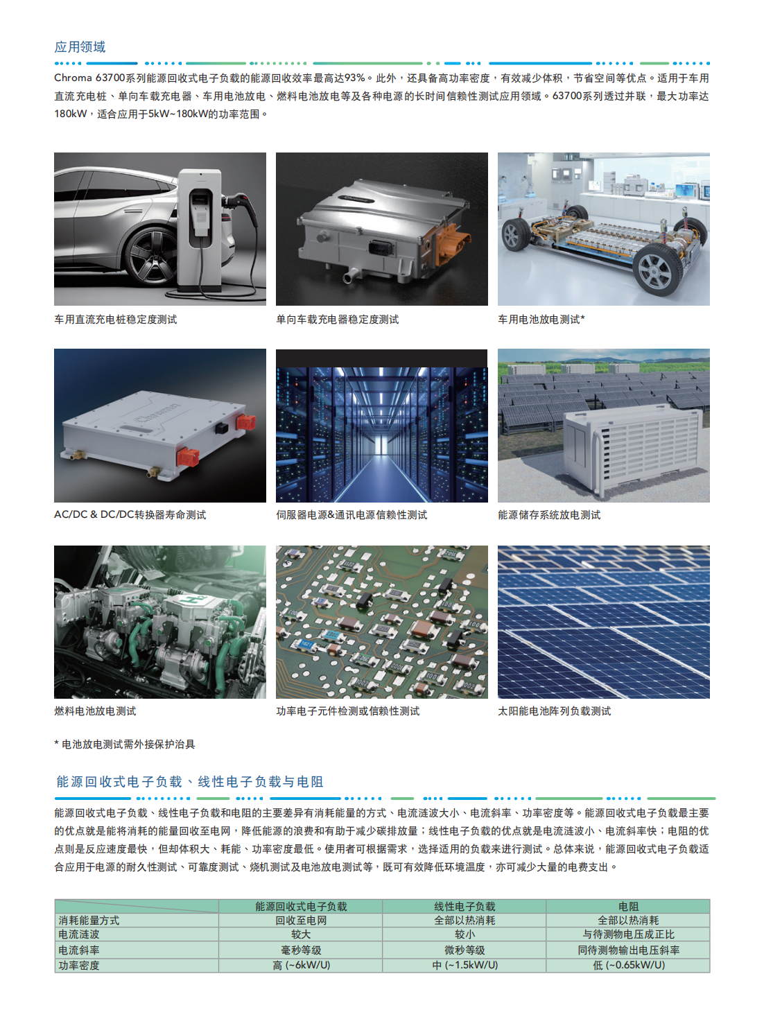63700系列能源回收式直流电子负载,适用于电动车电池放电、燃料电池放电、大功率电源老化、直流充电桩、单向车载充电器可靠性、燃料电池发动机系统、储能系统、AC/DC与DC/DC电源供应器、功率电子元件及电力电子元件等产品信赖性测试使用。